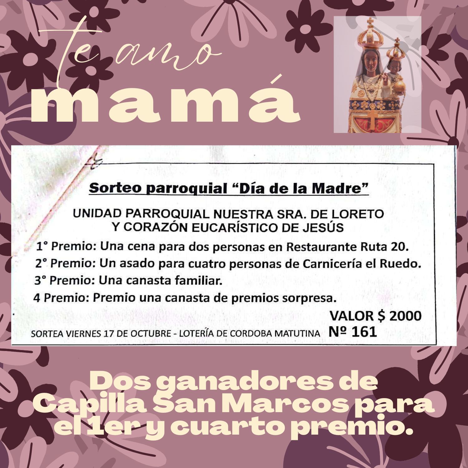 El viernes previo al día de la madre resultaron ganadores Silvia Berrondo del primer premio y Antonela Rena del cuarto premio. Ambos números fueron vendidos por feligreses de Capilla San Marcos. El segundo y tercer premio quedaron vacantes. Con lo recaudado se hará un fondo para cubrir gastos fijos de enero, en que disminuyen las ofrendas en la misa y para reparar el techo de San Marcos, dijo el párroco en las misas del fin de semana pasado. Así mismo agradeció a quienes compraron las rifas.